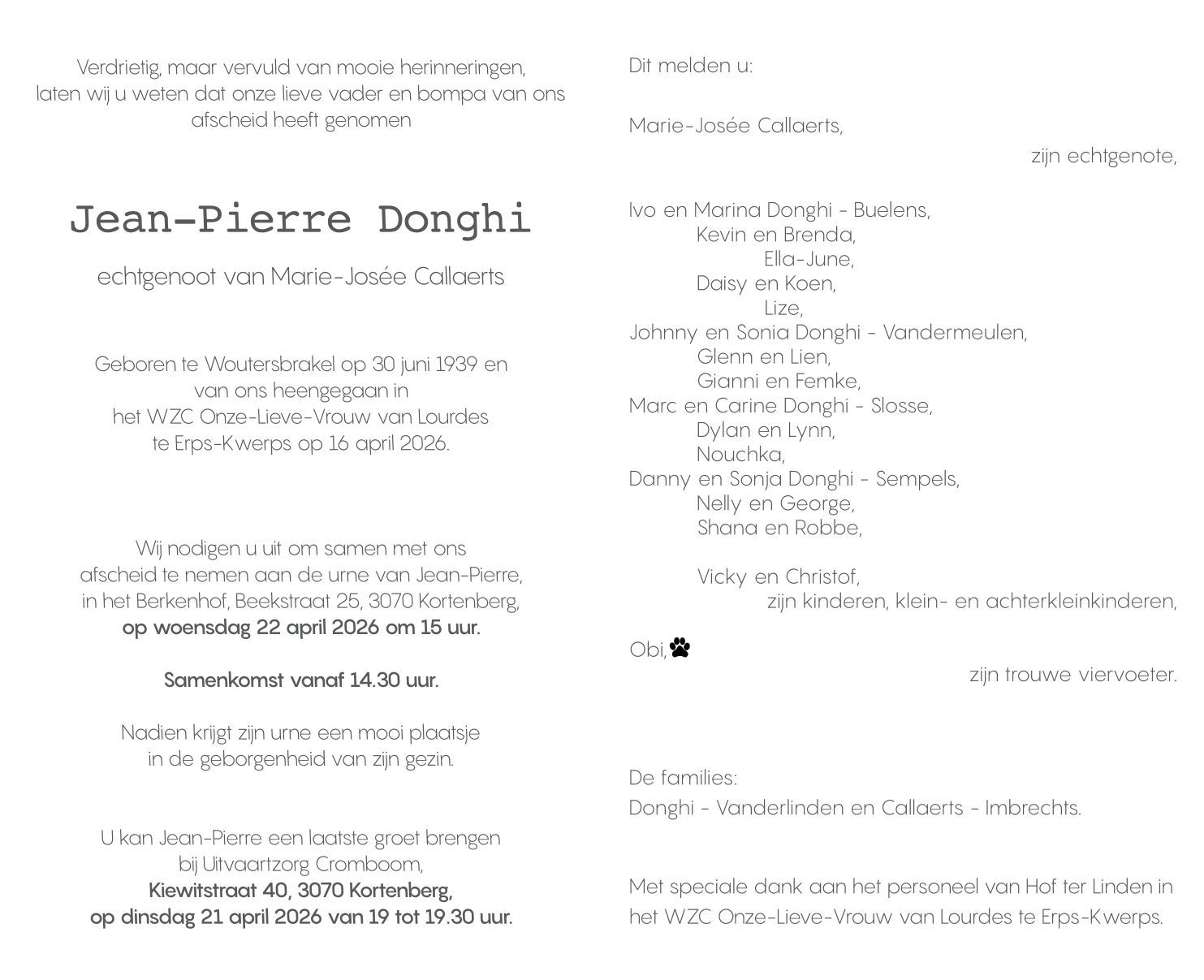 Crematorium Hofheide op woensdag 22 april om 7 u 30