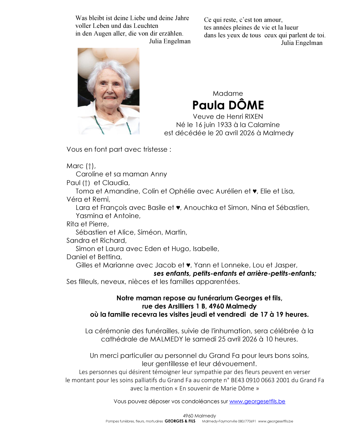 Avis de décès de Madame Paula DÔME veuve de Henri RIXEN