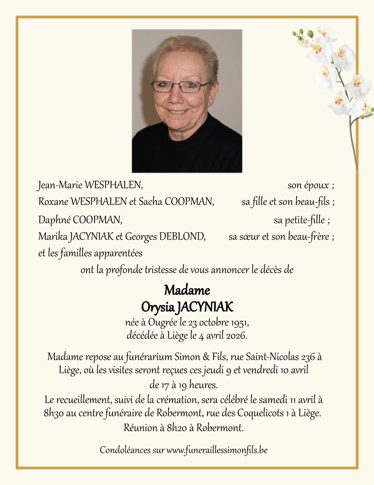 Overlijdensbericht van Madame Orysia JACYNIAK