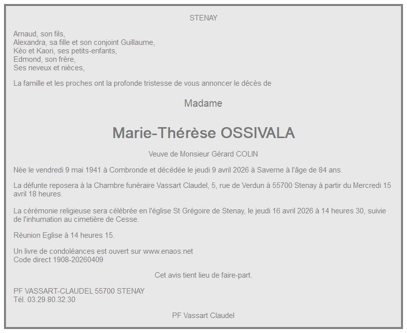 Avis de décès de Madame Marie-Thérèse COLIN née OSSIVALA