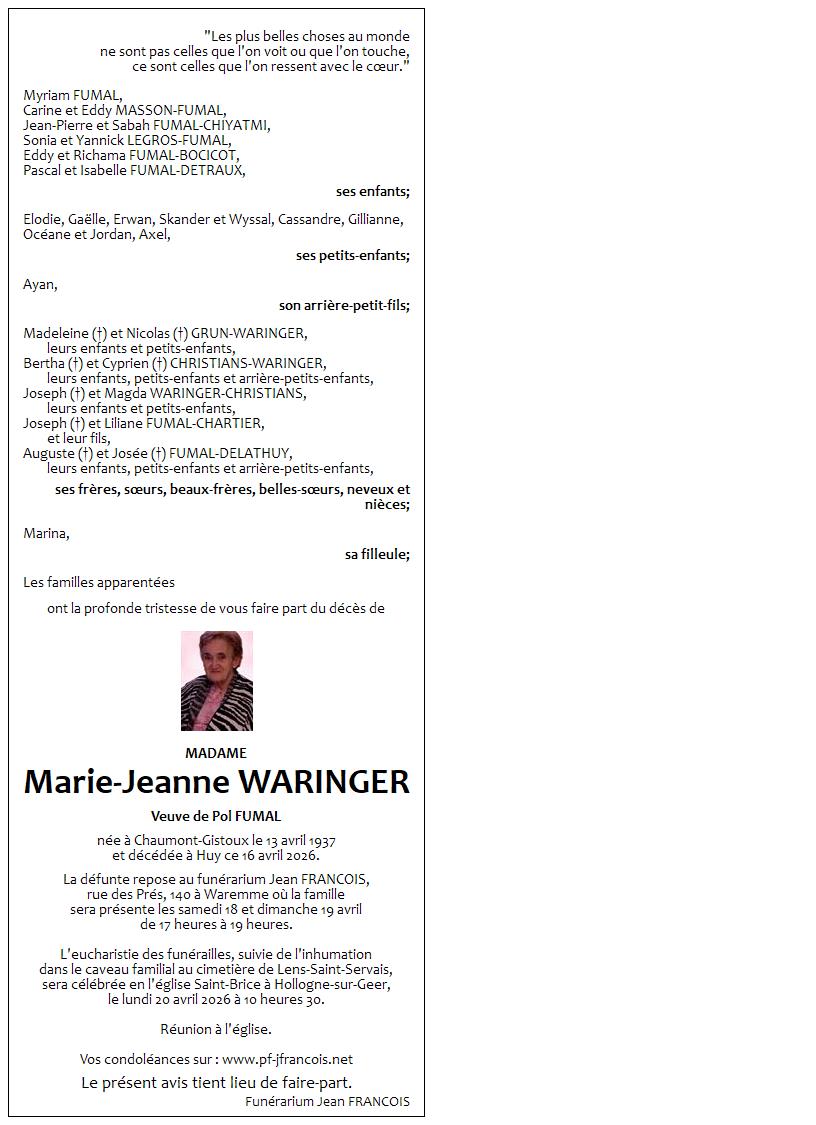 Avis de décès de Madame Marie-Jeanne WARINGER