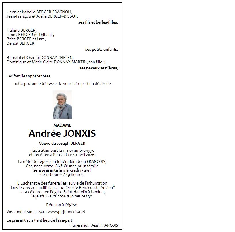 Avis de décès de Madame Andrée JONXIS