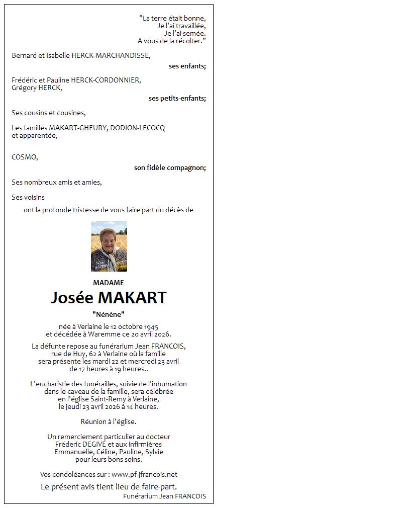 Décédée à Waremme (4300) le lundi 20 avril 2026 à l'âge de 80 ans