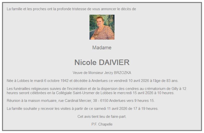 Avis de décès de Madame Nicole DAIVIER