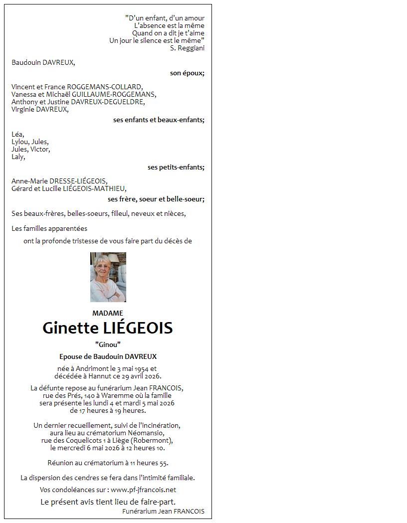 Avis de décès de Madame Ginette LIÉGEOIS