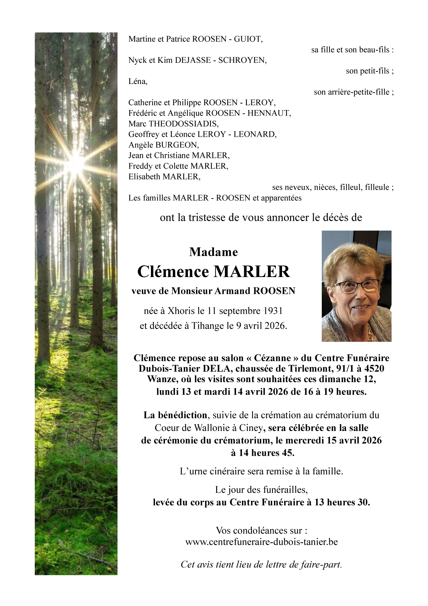 Visites, les dimanche 12 et lundi 13 avril 2026 de 16 à 19 heures dans le salon Cézanne du Centre Funéraire Dubois-Tanier à Wanze.