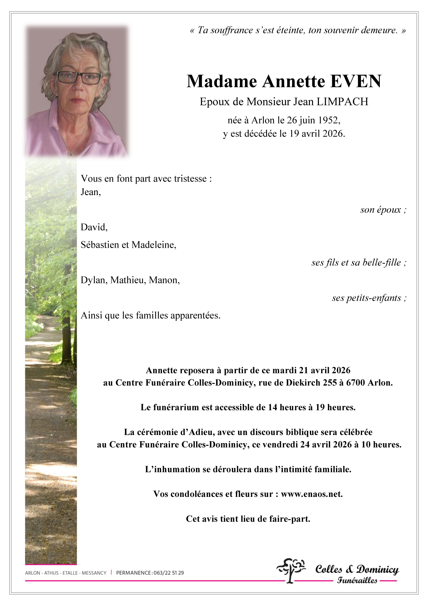 Décédée à Arlon (6700) le dimanche 19 avril 2026 à l'âge de 73 ans