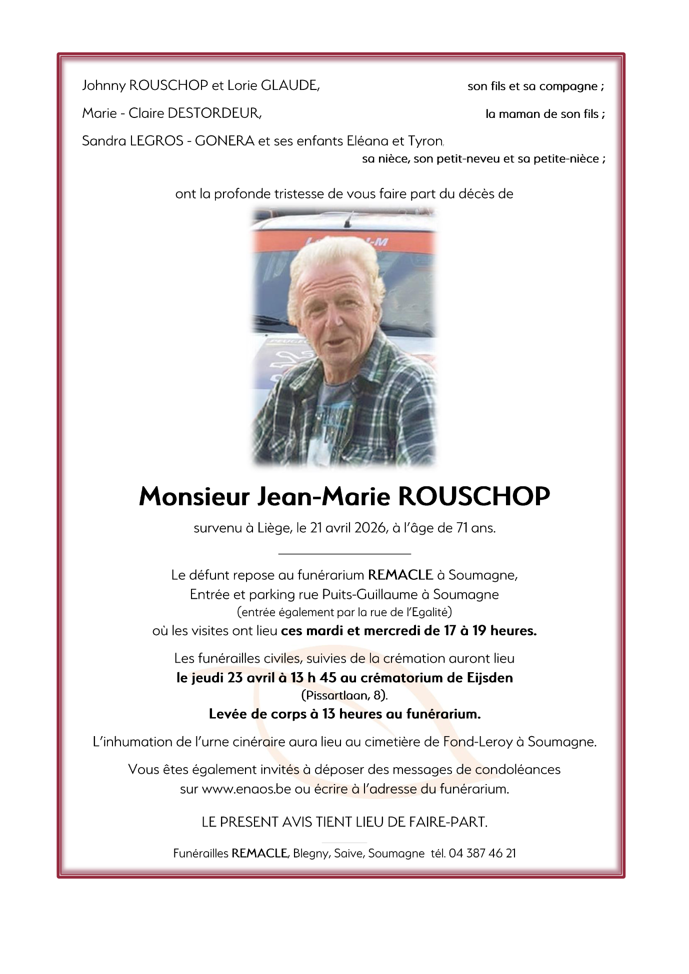 Avis de décès de Monsieur Jean-Marie ROUSCHOP