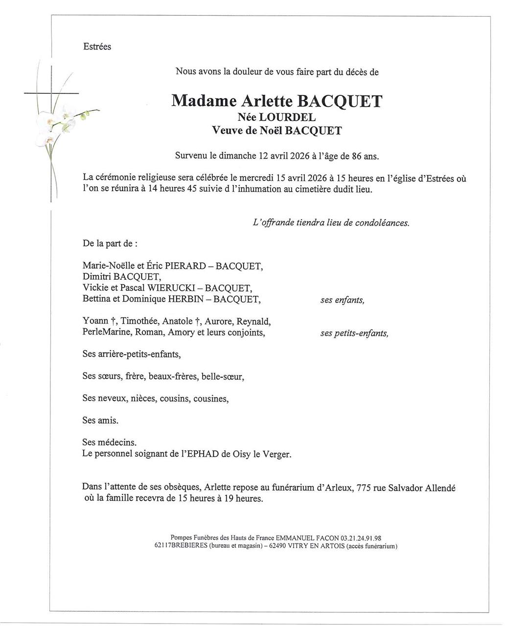 Overlijdensbericht van Madame Arlette BACQUET geboren LOURDEL