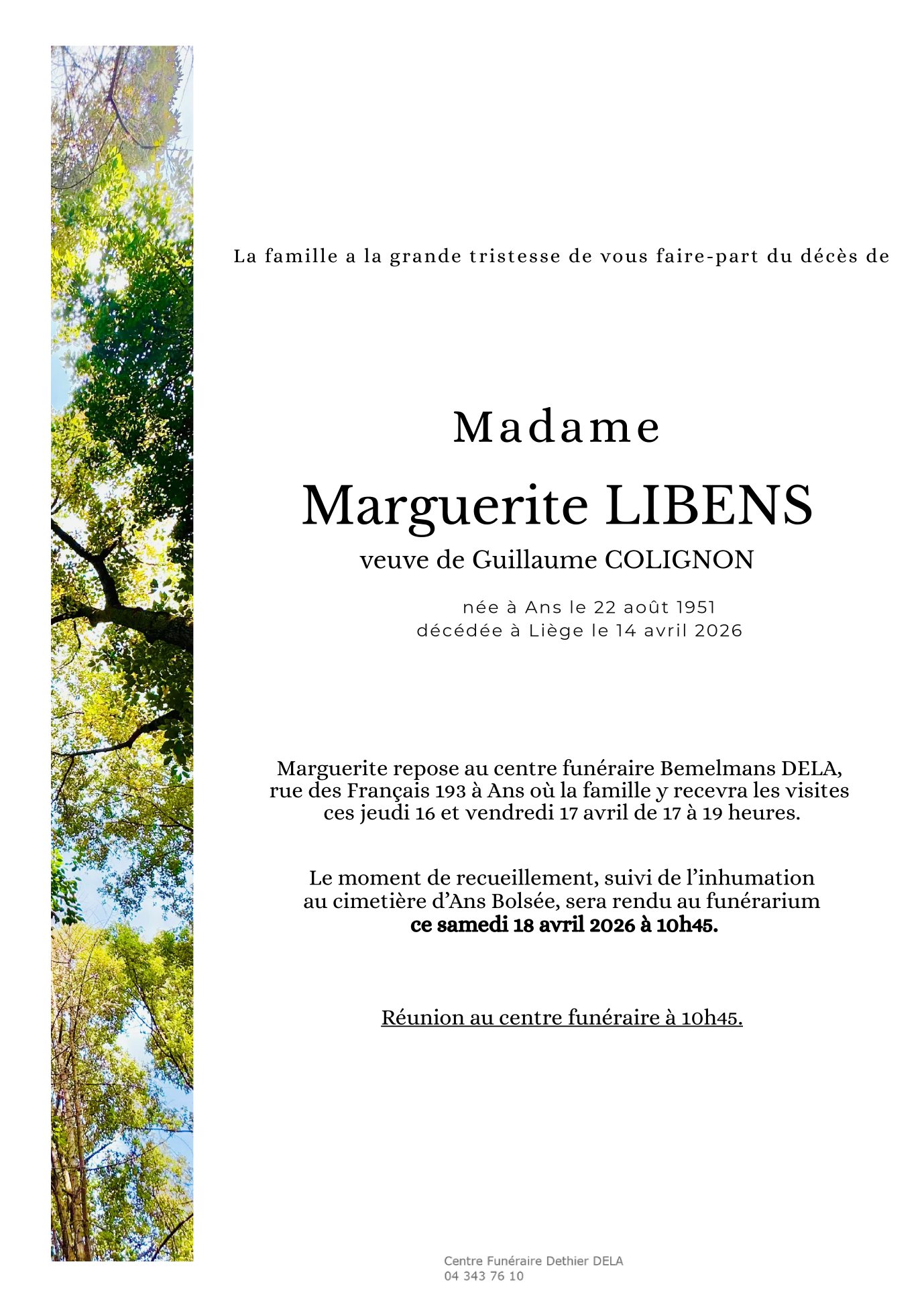 Décédée à Liège (4000) le mardi 14 avril 2026 à l'âge de 74 ans