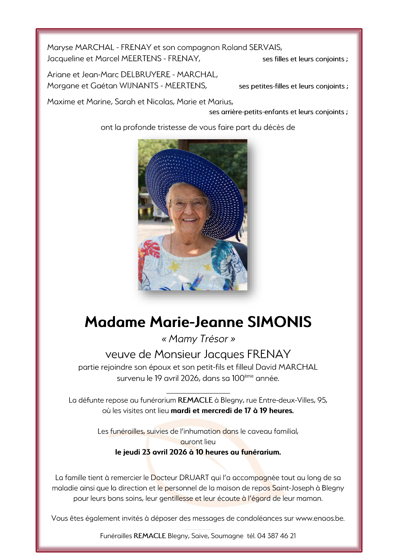 Funérailles REMACLE de Blegny le jeudi 23 avril à 10 heures