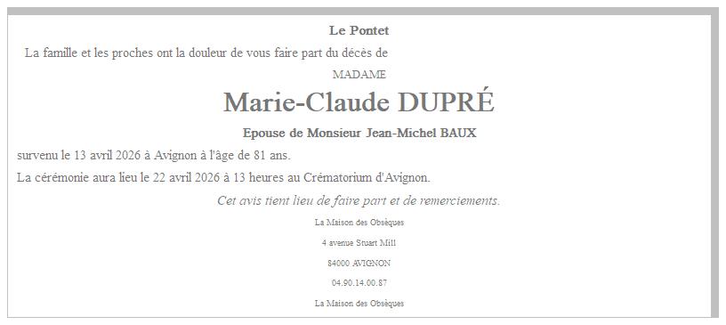 Avis de décès de Madame Marie-Claude BAUX née DUPRÉ