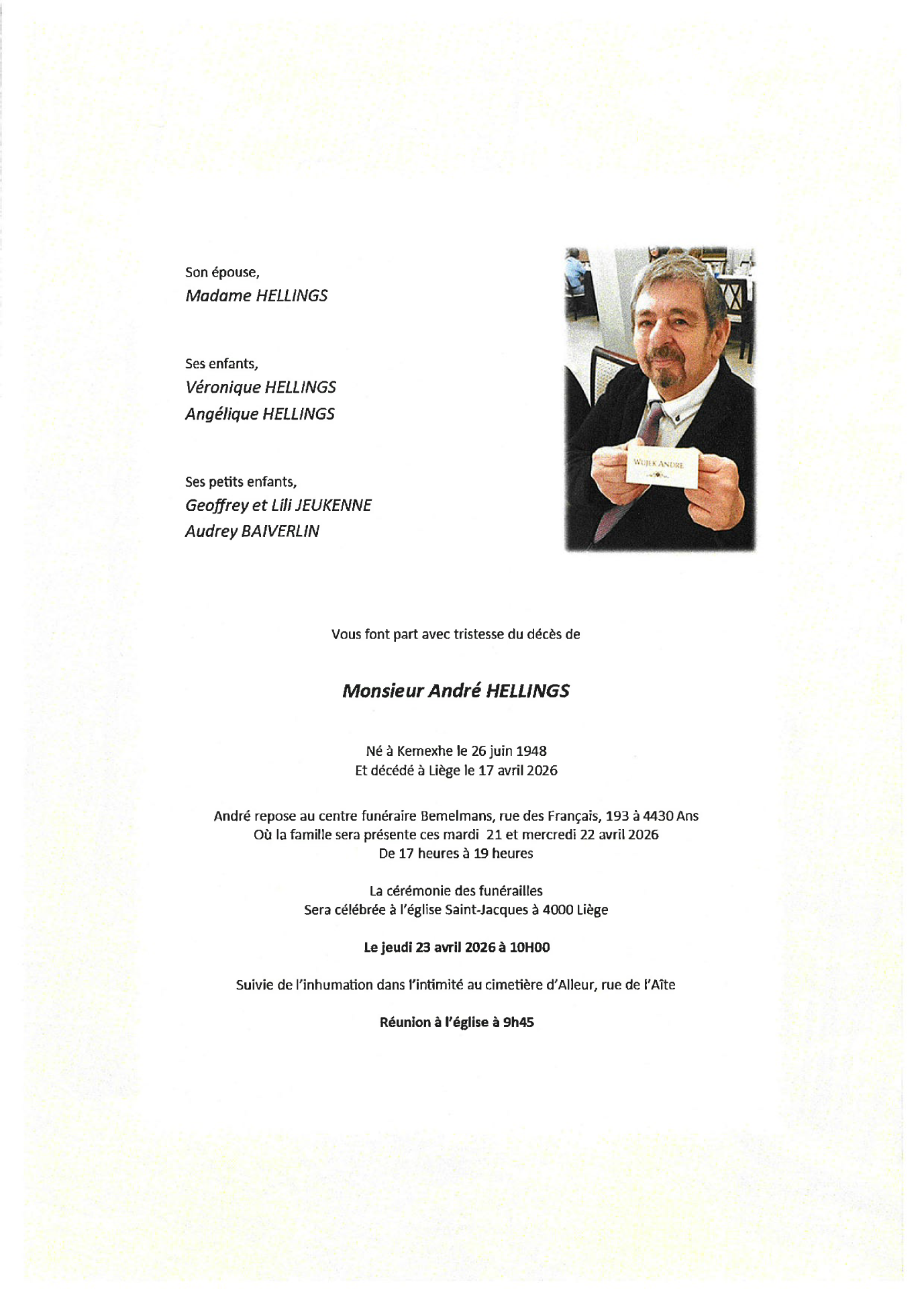 Avis de décès de Monsieur André HELLINGS