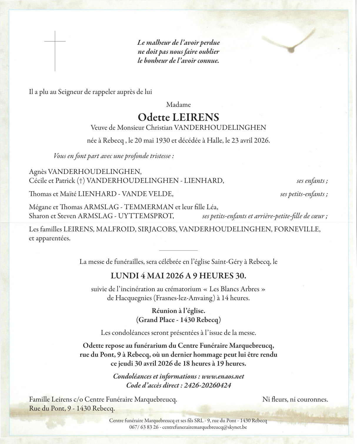 Avis de décès de Madame Odette LEIRENS