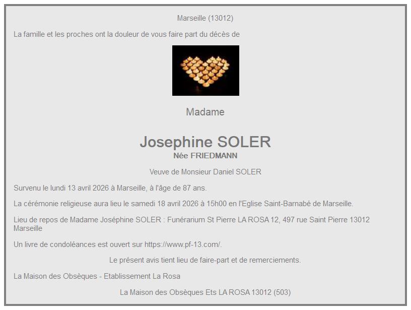 Avis de décès de Madame Josephine SOLER née FRIEDMANN