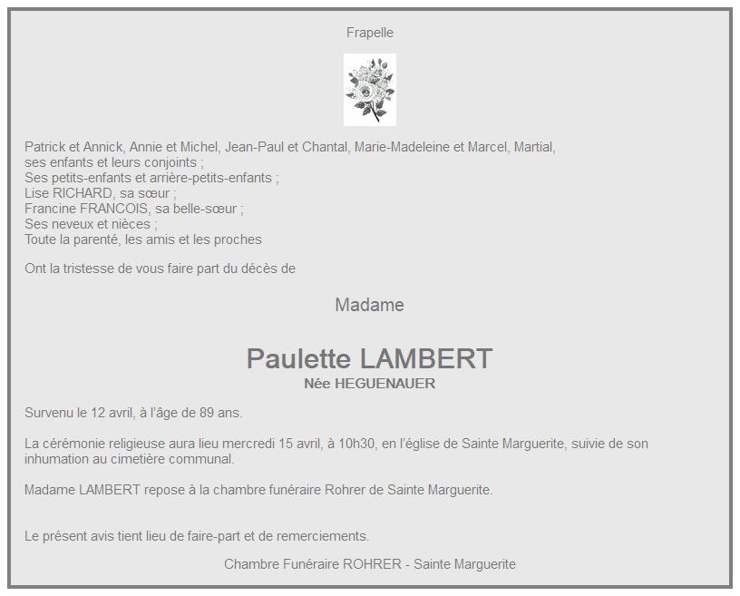 Avis de décès de Madame Paulette LAMBERT née HEGUENAUER