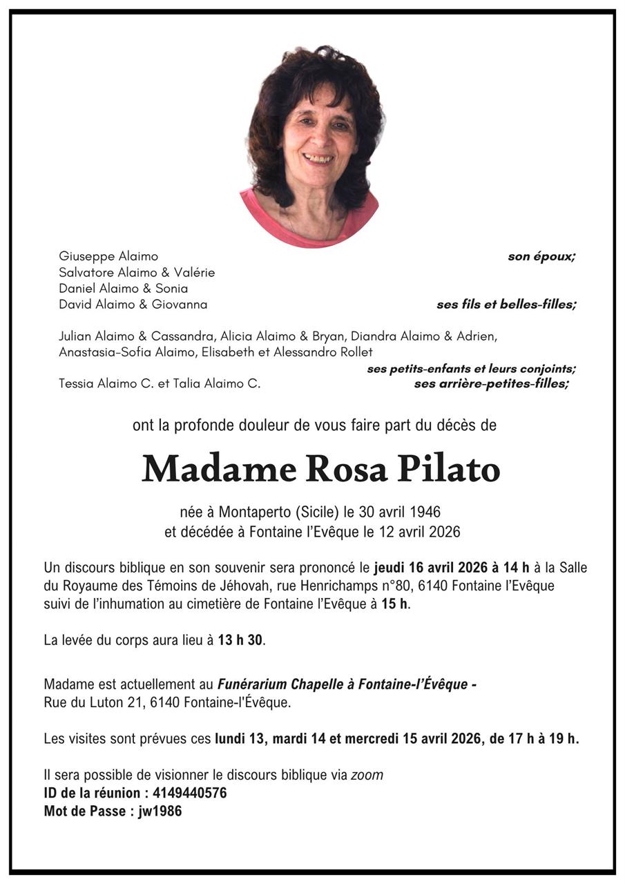 salle du Royame des Témoins de Jéhovah de Fontaine-l'Evêque le jeudi 16 avril à 14 heures