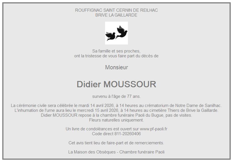Avis de décès de Monsieur Didier MOUSSOUR