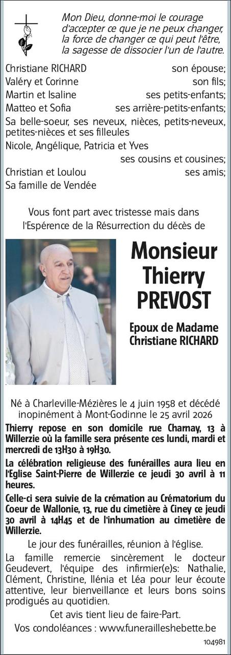 crématorium du Coeur de Wallonie le jeudi 30 avril à 14 heures 30