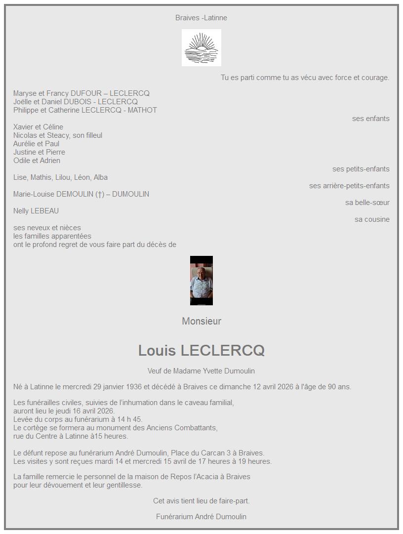 Décédé à Braives (4260) le dimanche 12 avril 2026 à l'âge de 90 ans