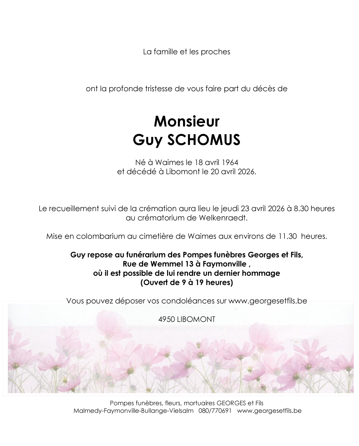 Centre Funéraire de Welkenraedt le jeudi 23 avril à 8 heures 30