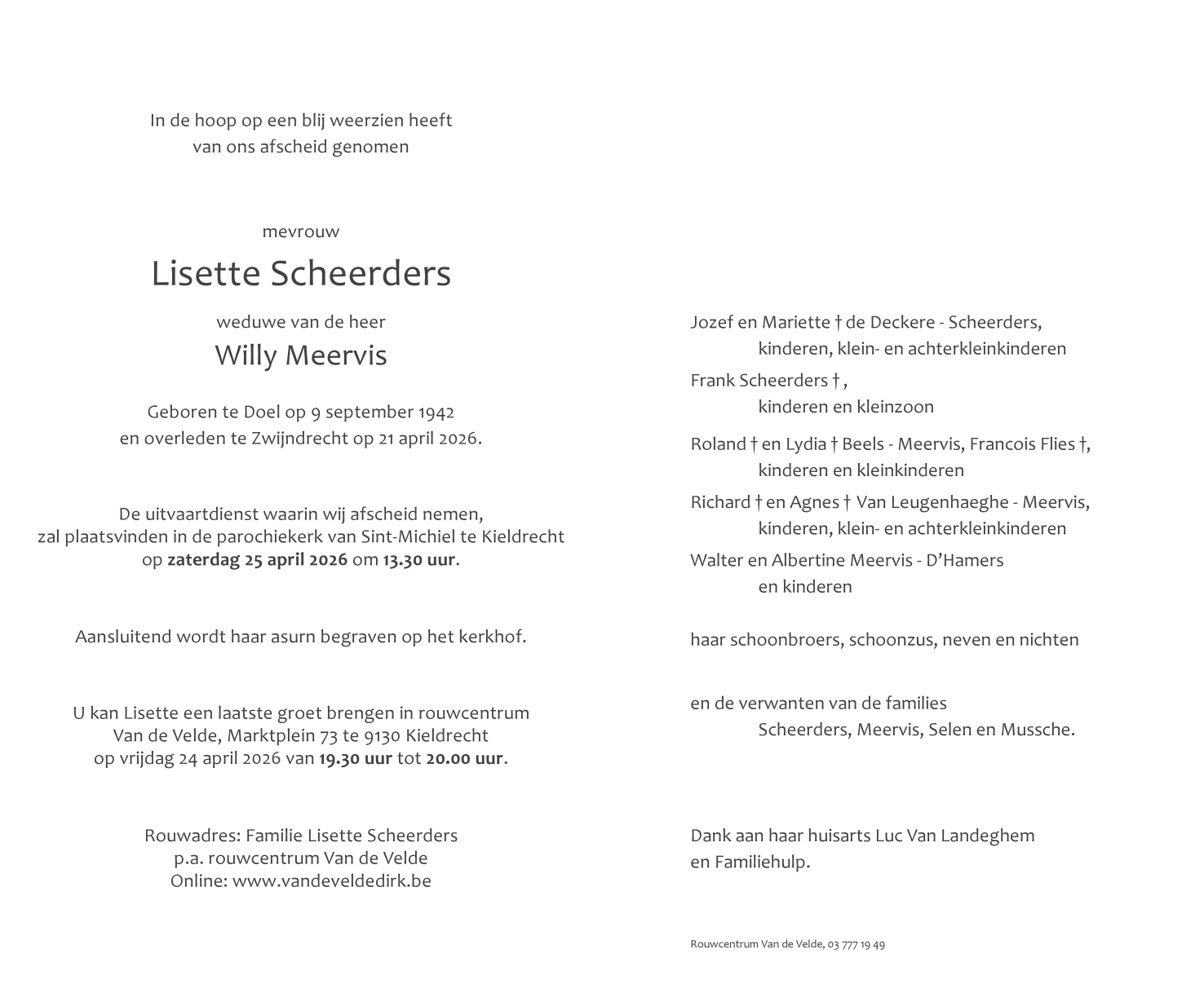 Avis de décès de Madame Lisette Scheerders
