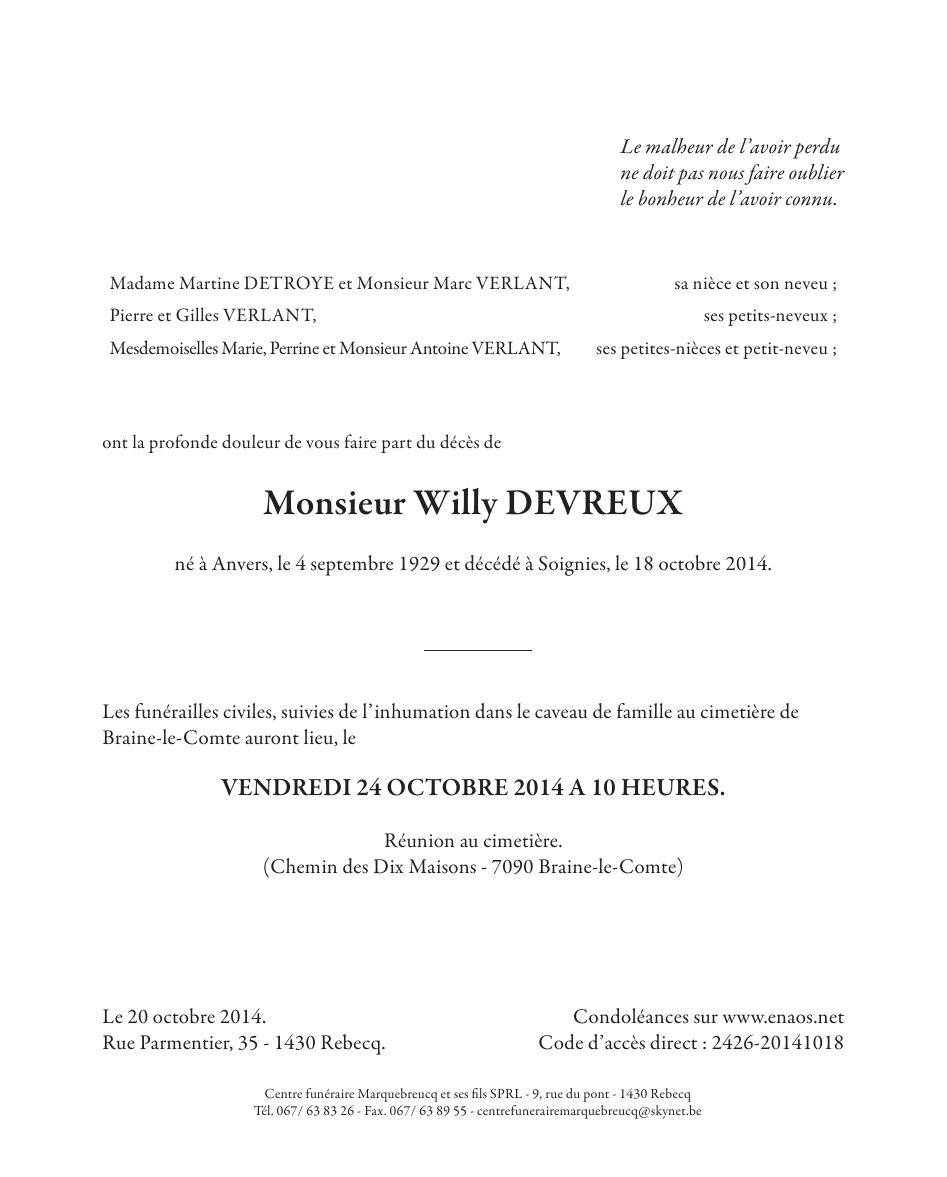 Décédé à Soignies (7060) le samedi 18 octobre 2014 à l'âge de 85 ans