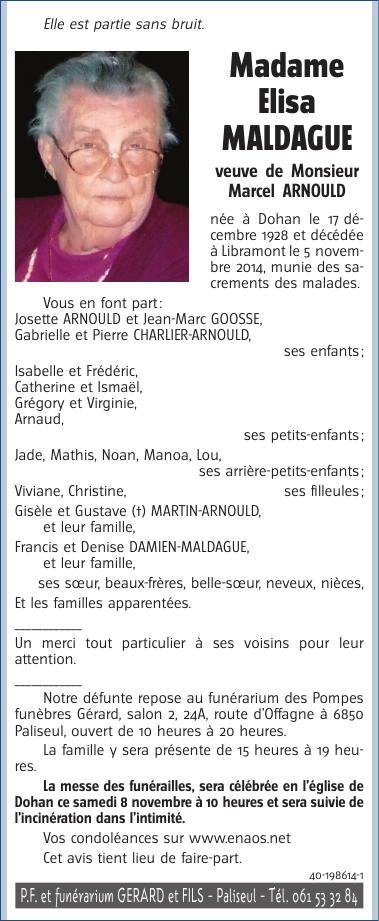 Décédée à Libramont (6800) le mercredi 5 novembre 2014 à l'âge de 85 ans