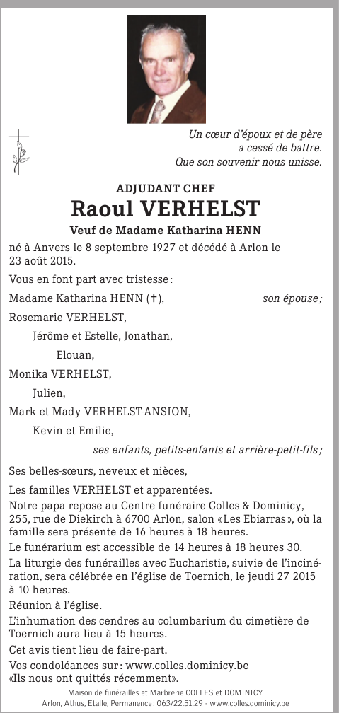 Fallecido en Arlon (6700) el domingo, 23 de agosto de 2015 a la edad de 87 años