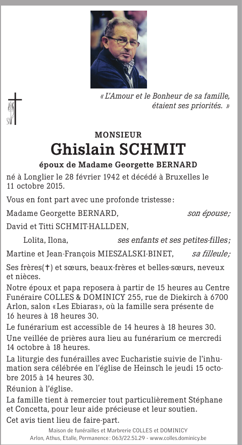 Died in Bruxelles (Woluwe-Saint-Lambert) (1200) on 11 October 2015 at the age of 73 years