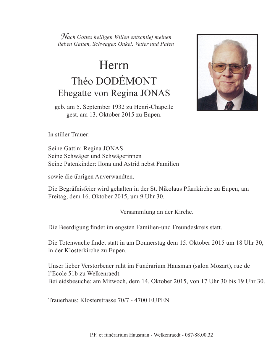 Fallecido en Eupen (4700) el martes, 13 de octubre de 2015 a la edad de 83 años