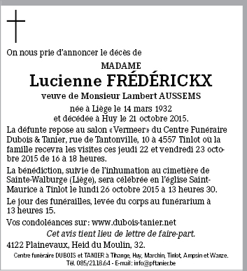 Décédée à Huy (4500) le mercredi 21 octobre 2015 à l'âge de 83 ans