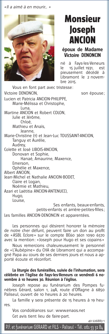 Décédé à Libramont (6800) le lundi 2 novembre 2015 à l'âge de 84 ans