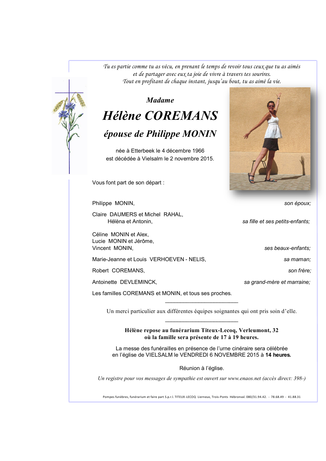 Décédée à Vielsalm (6690) le lundi 2 novembre 2015 à l'âge de 48 ans