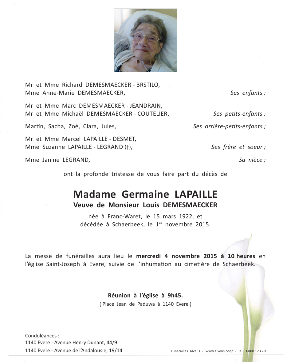 Décédée à Bruxelles (Schaerbeek) (1030) le dimanche 1 novembre 2015 à l'âge de 93 ans