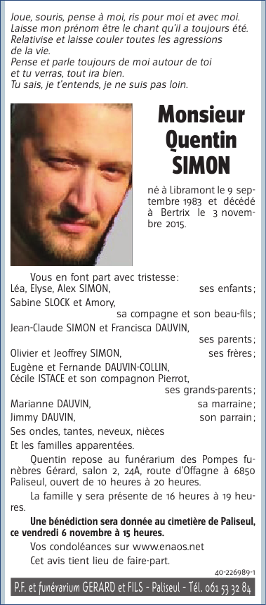 Fallecido en Bertrix (6880) el miércoles, 4 de noviembre de 2015 a la edad de 32 años