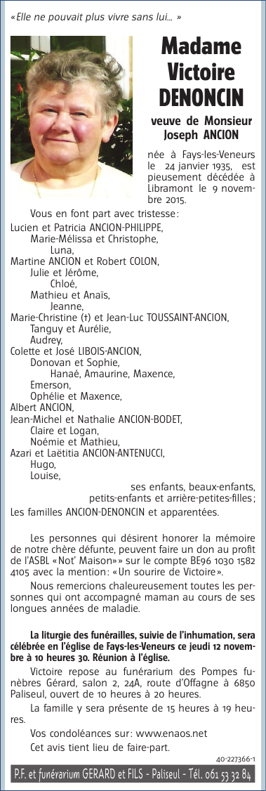 Décédée à Libramont (6800) le lundi 9 novembre 2015 à l'âge de 80 ans