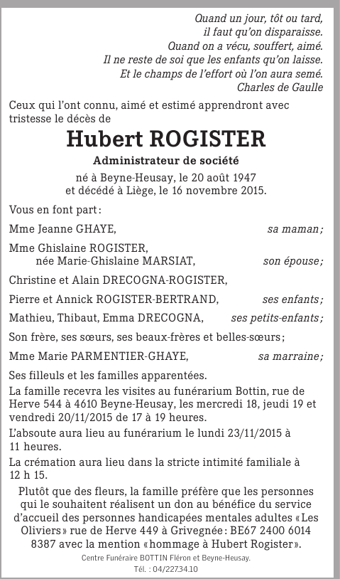 Décédé à Liège (4000) le lundi 16 novembre 2015 à l'âge de 68 ans