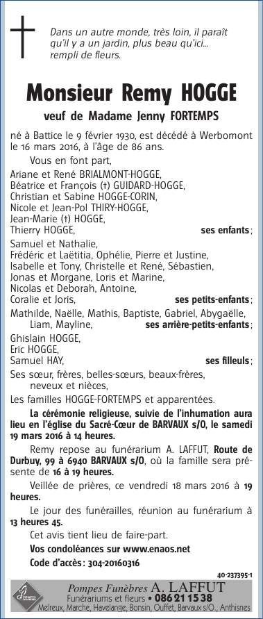 Décédé à Werbomont (4190) le mercredi 16 mars 2016 à l'âge de 86 ans