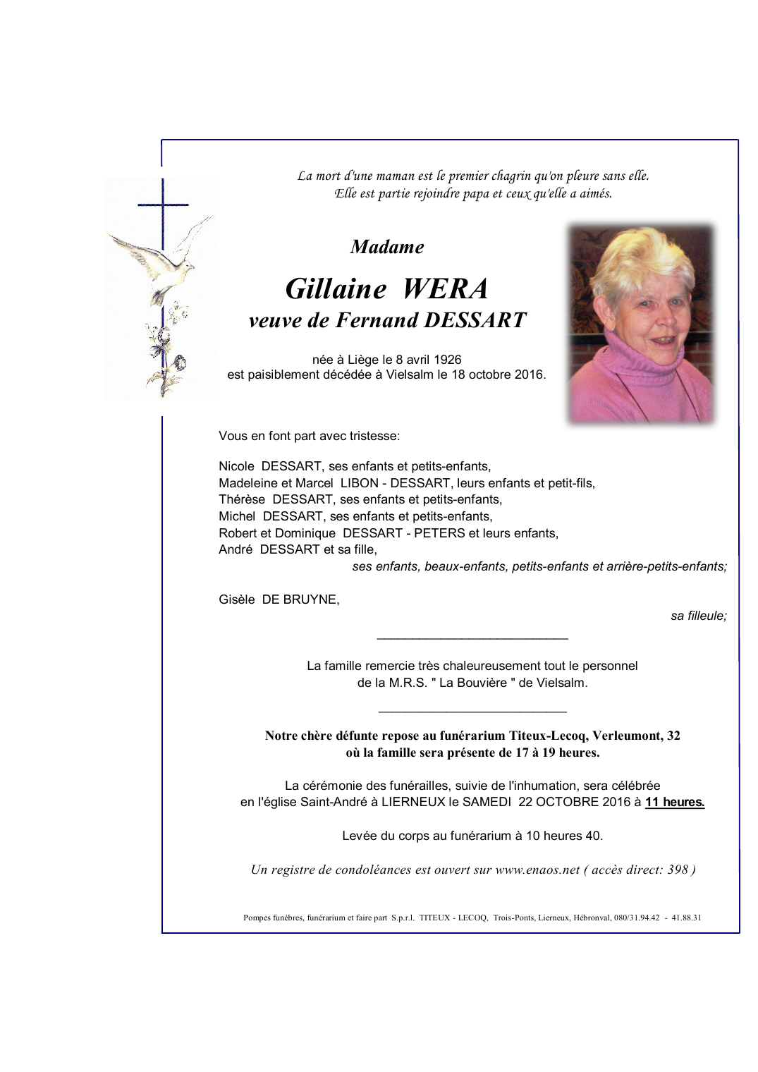 Décédée à Vielsalm (6690) le mardi 18 octobre 2016 à l'âge de 90 ans