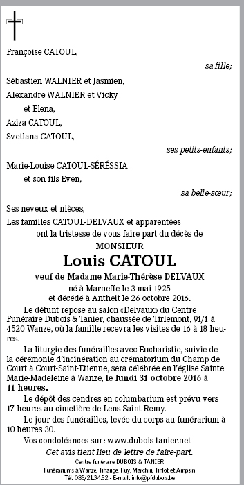 Décédé à Antheit (4520) le mercredi 26 octobre 2016 à l'âge de 91 ans