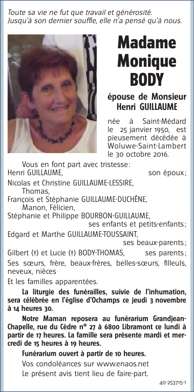 Décédée à Bruxelles (Woluwe-Saint-Lambert) (1200) le dimanche 30 octobre 2016 à l'âge de 66 ans