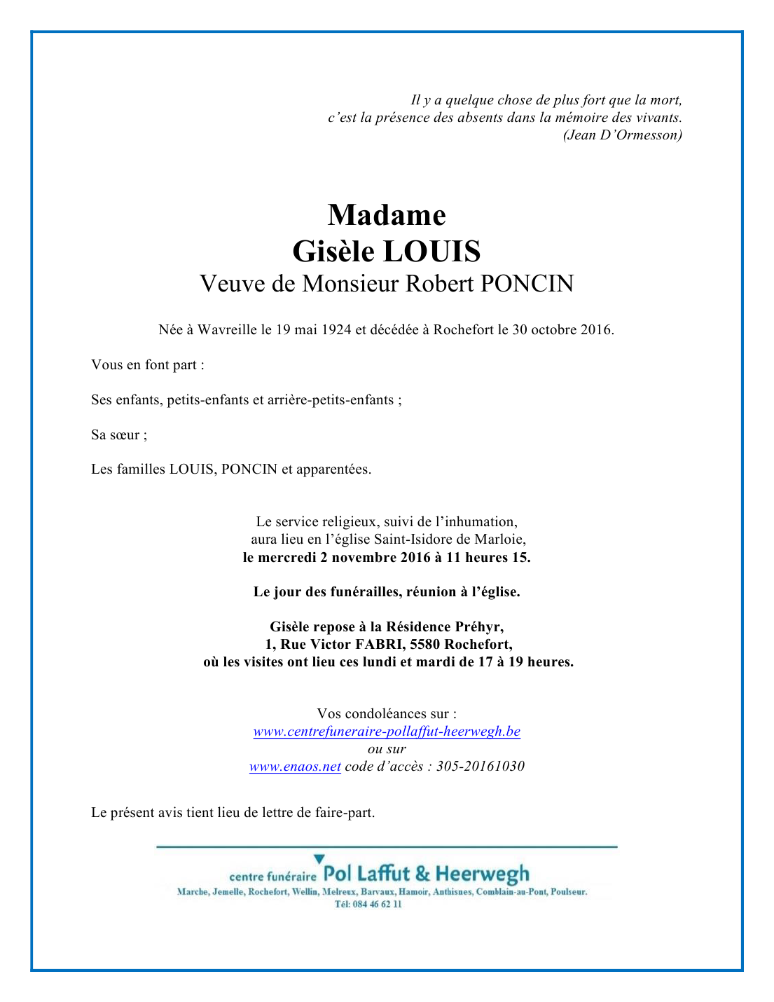 Fallecida en Rochefort (5580) el domingo, 30 de octubre de 2016 a la edad de 92 años
