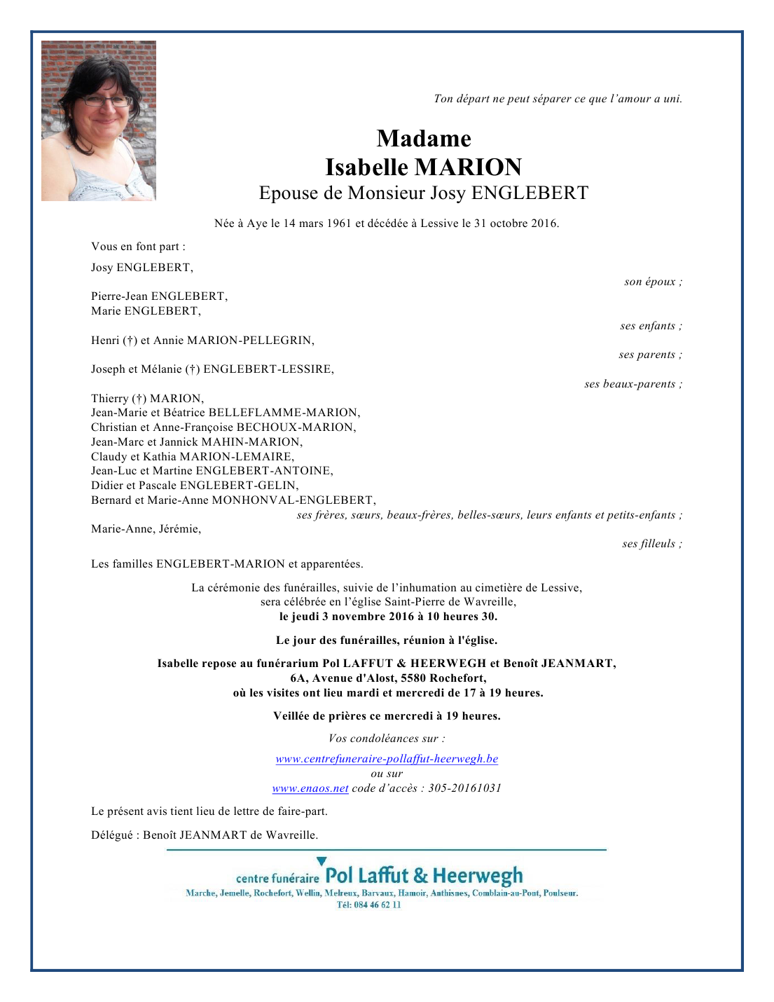Décédée à Lessive (5580) le lundi 31 octobre 2016 à l'âge de 55 ans