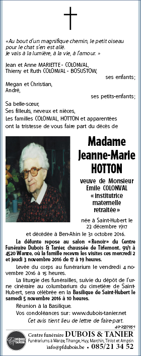 Décédée à Huy (4500) le lundi 31 octobre 2016 à l'âge de 98 ans