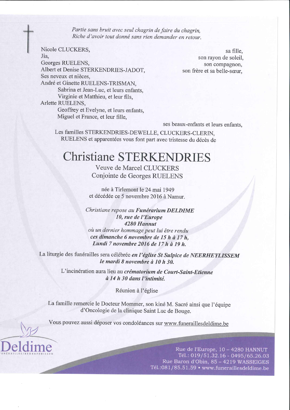 Décédée à Namur (5000) le samedi 5 novembre 2016 à l'âge de 67 ans