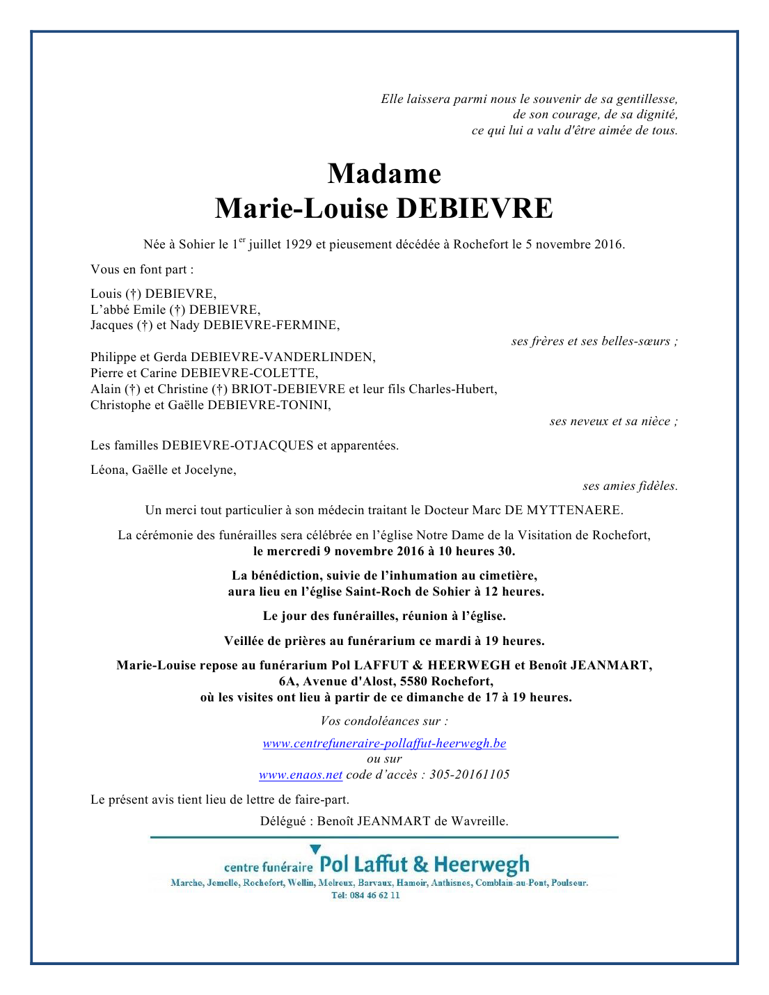 Décédée à Rochefort (5580) le samedi 5 novembre 2016 à l'âge de 87 ans