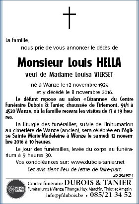 Décédé à Wanze (4520) le mardi 8 novembre 2016 à l'âge de 90 ans