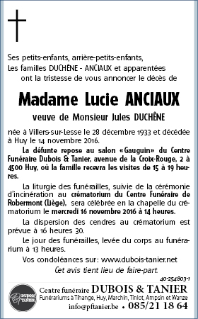 Décédée à Huy (4500) le lundi 14 novembre 2016 à l'âge de 82 ans