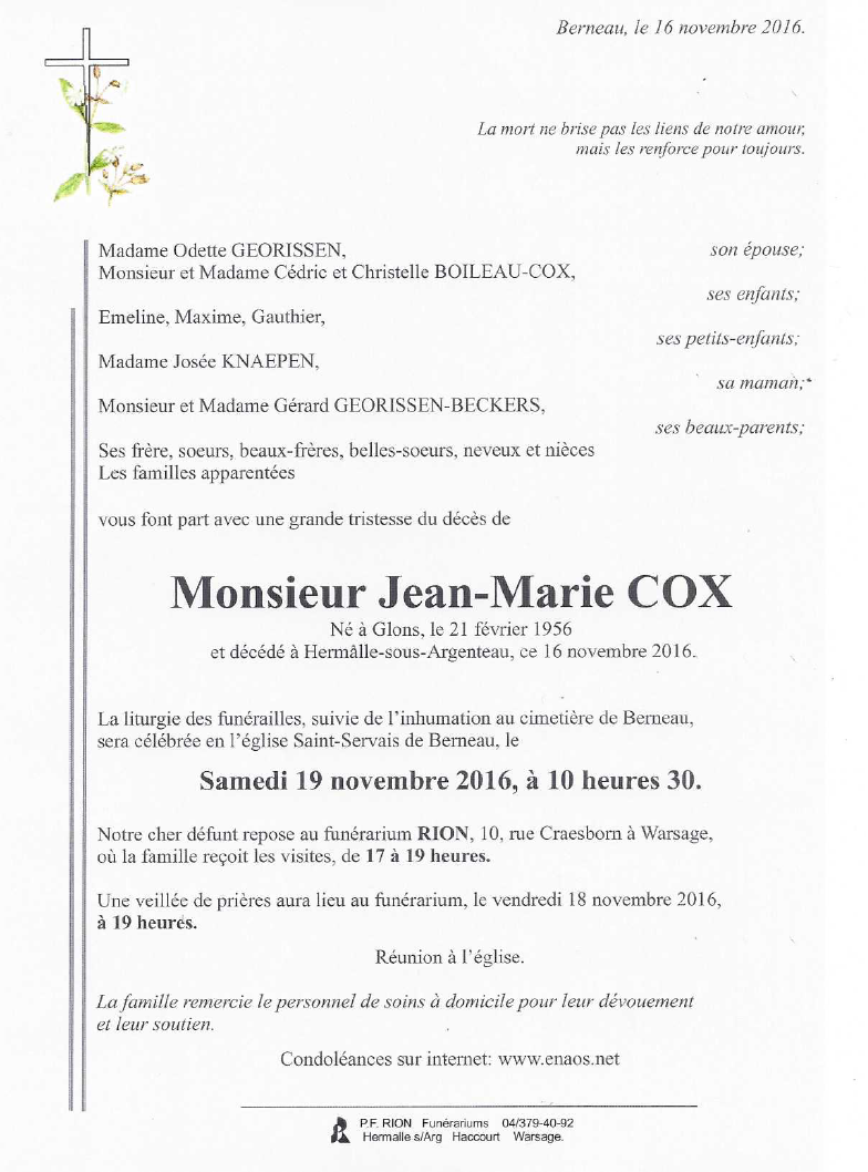 Décédé à Hermalle-sous-Argenteau (4681) le mercredi 16 novembre 2016 à l'âge de 60 ans